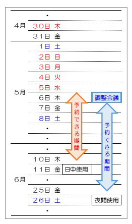 | 夜間使用の場合 使用希望日の前の月の最初の平日に行われる調整会議から 詳しくはお問い合わせください。 |